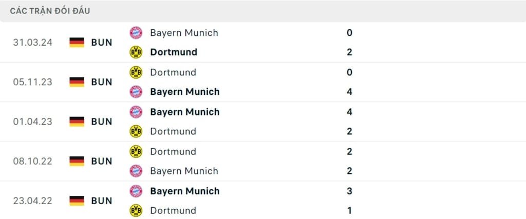 Thành tích đối đầu Dortmund vs Bayern Munich