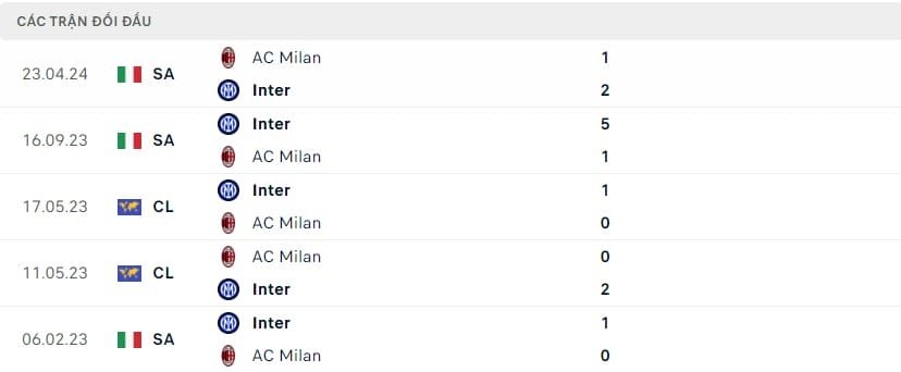Kết quả các trận đấu gần đây giữa Inter Milan vs AC Milan