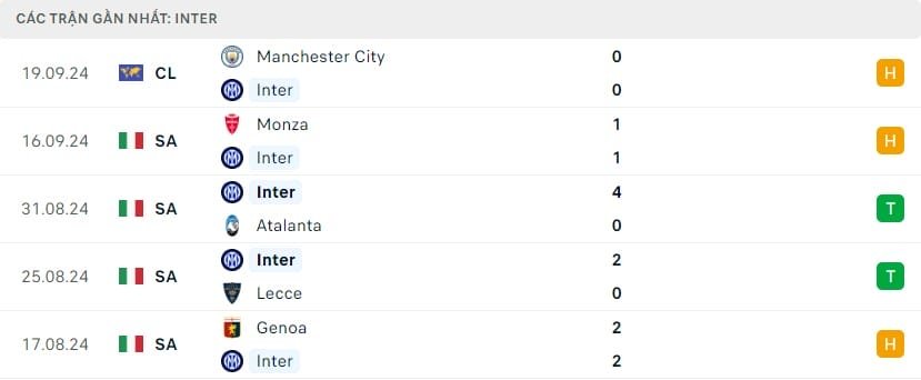 Phong độ Inter Milan