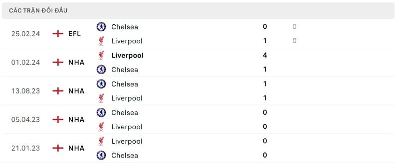 Kết quả đối đầu các trận gần đây nhất của Liverpool vs Chelsea