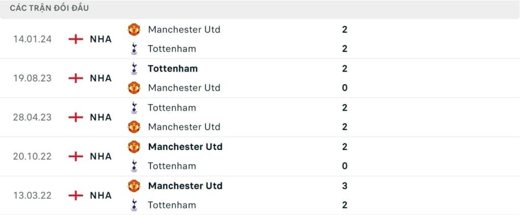 Thành tích đối đầu giữa Man United và Tottenham đã cân bằng hơn rất nhiều so với quá khứ. Trong 5 cuộc chạm trán gần nhất, Man United có 2 thắng, nhiều hơn 1 so với Spurs và cùng có 2 trận hòa 2-2. Chiến thắng gần nhất của Spurs tại Old Trafford đã diễn ra từ năm 2020 với tỷ số không tưởng 6-1.