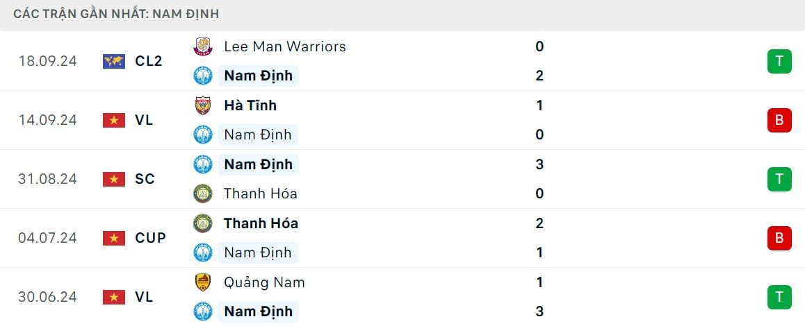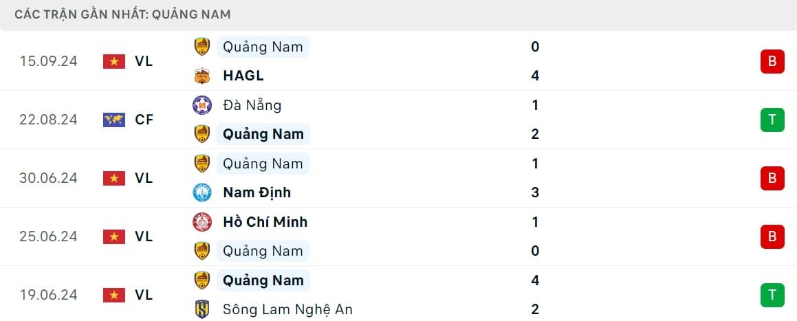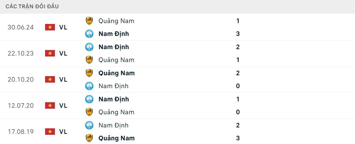 Kết quả đối đầu các trận gần đây nhất của Nam Định vs Quảng Nam