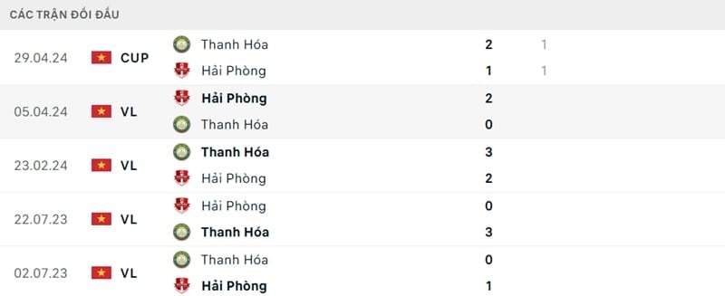Kết quả đối đầu các trận gần đây nhất của Thanh Hóa vs Hải Phòng