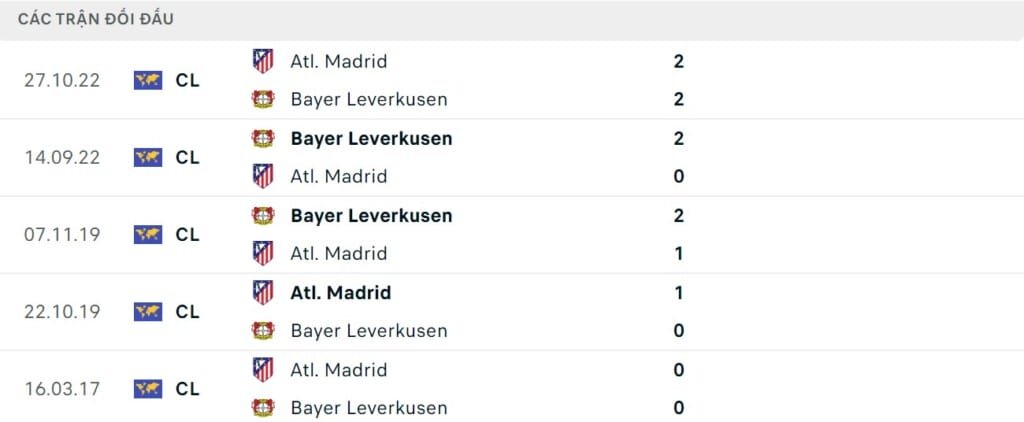 Từ năm 2017 đến nay, Atletico Madrid và Bayer Leverkusen có duyên chạm trán nhau tại Champions League khá nhiều. Lần gặp gỡ gần nhất kết thúc với tỷ số hòa 2-2. Ở 4 lần trước nữa, Leverkusen chiếm ưu thế với 2 chiến thắng, Atletico Madrid có 1 chiến thắng và 1 trận hòa.