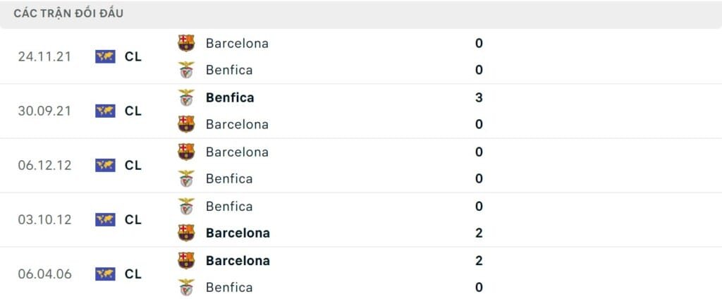Thành tích đối đầu Benfica vs Barcelona