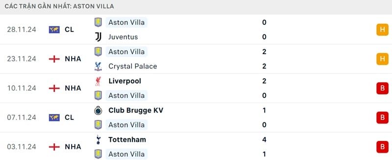 Trong khi đó, Aston Villa trải qua chuỗi 7 trận không thắng kể từ khi hạ Bologna tại Champions League. Thất bại trước Tottenham và Liverpool, cùng trận hòa trước Crystal Palace, khiến họ rơi khỏi top 8 châu Âu.