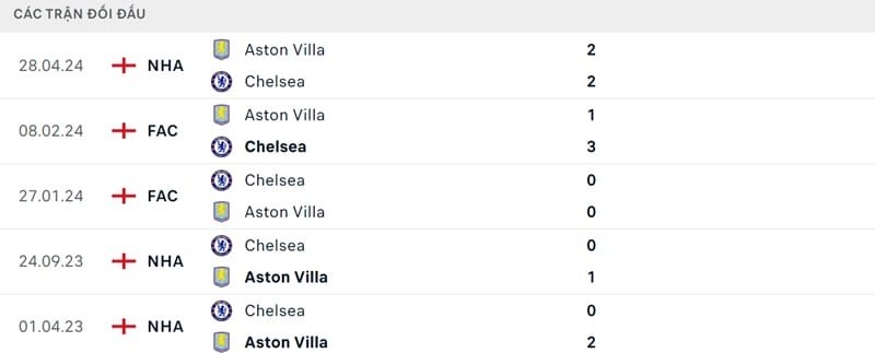 Thành tích đối đầu Chelsea vs Aston Villa