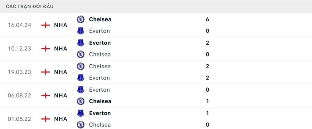 Chelsea đã hủy diệt Everton 6 bàn không gỡ trong lần chạm trán gần nhất, nhưng tính rộng ra, Everton đã có 2 chiến thắng và 1 trận hòa trước The Blues trong 5 lần gặp gỡ gần đây giữa đôi bên.