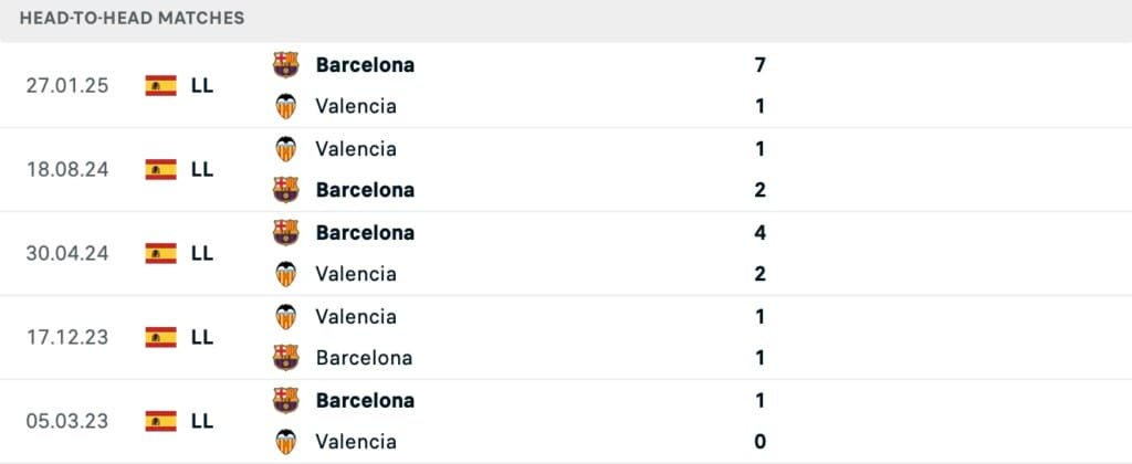 Barcelona vừa huỷ diệt Valencia đến 7-1 trong lần chạm trán tại Nou Camp mới đây. Điều đó cho thấy sự chênh lệch giữa đôi bên ở mùa giải này. Đồng thời, Valencia chỉ có 1 trận hoà trong 5 lần gặp nhau gần nhất với Barca, còn lại là 4 trận toàn thua.